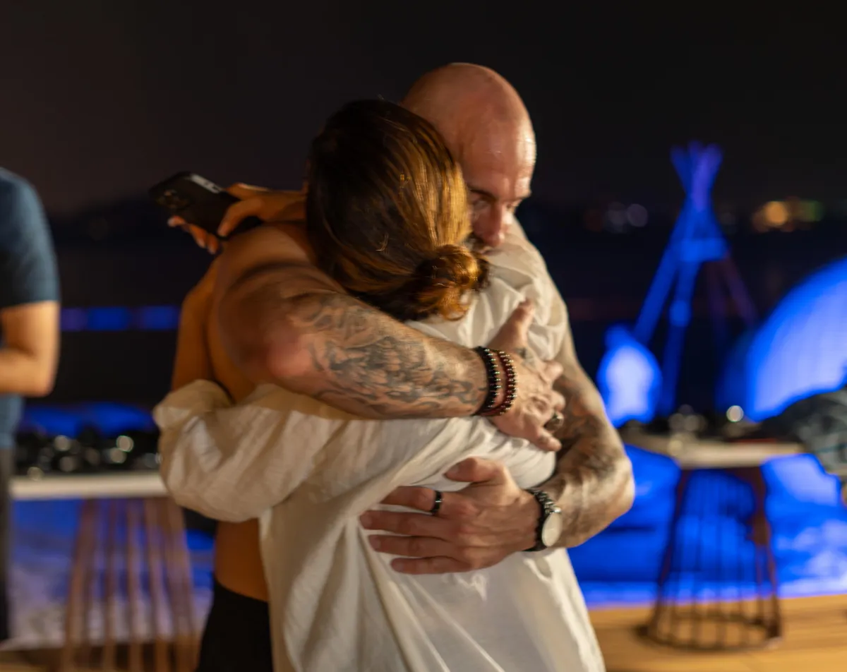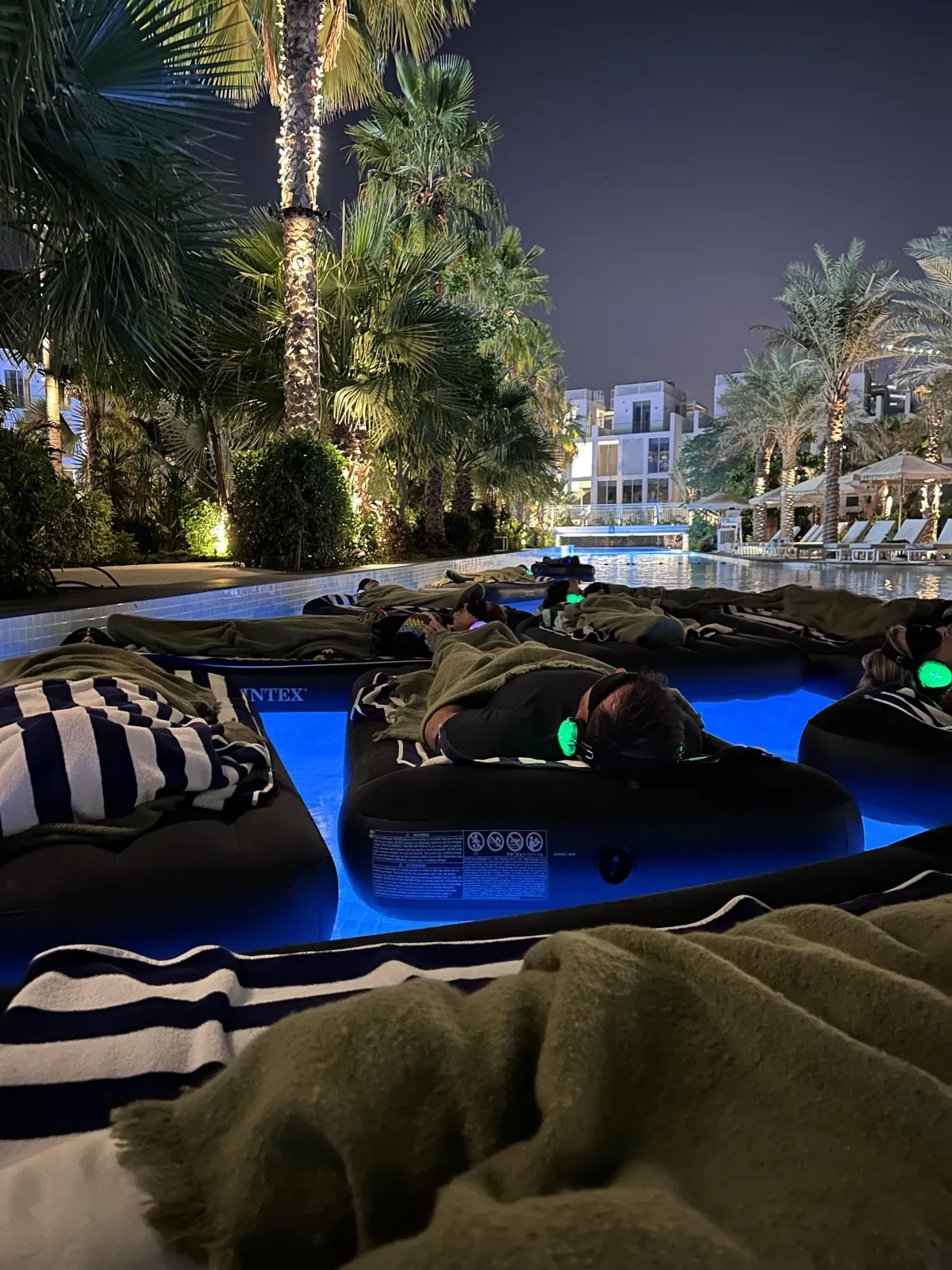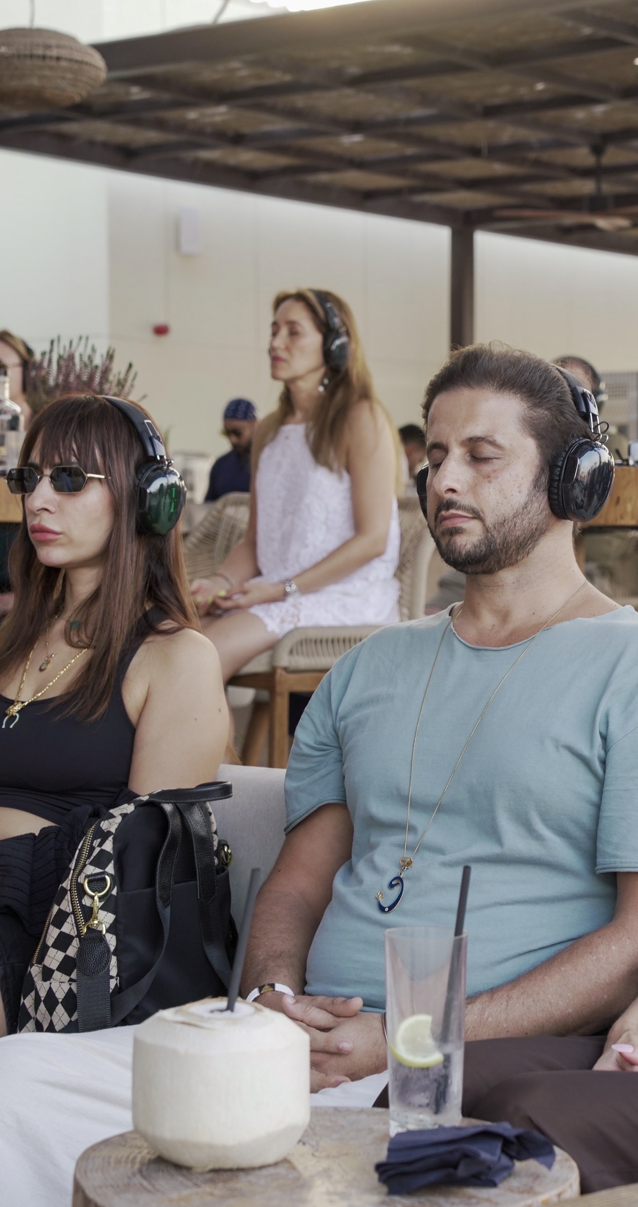 Group breathwork and meditation delivered through headphones, creating a deeply personal experience.