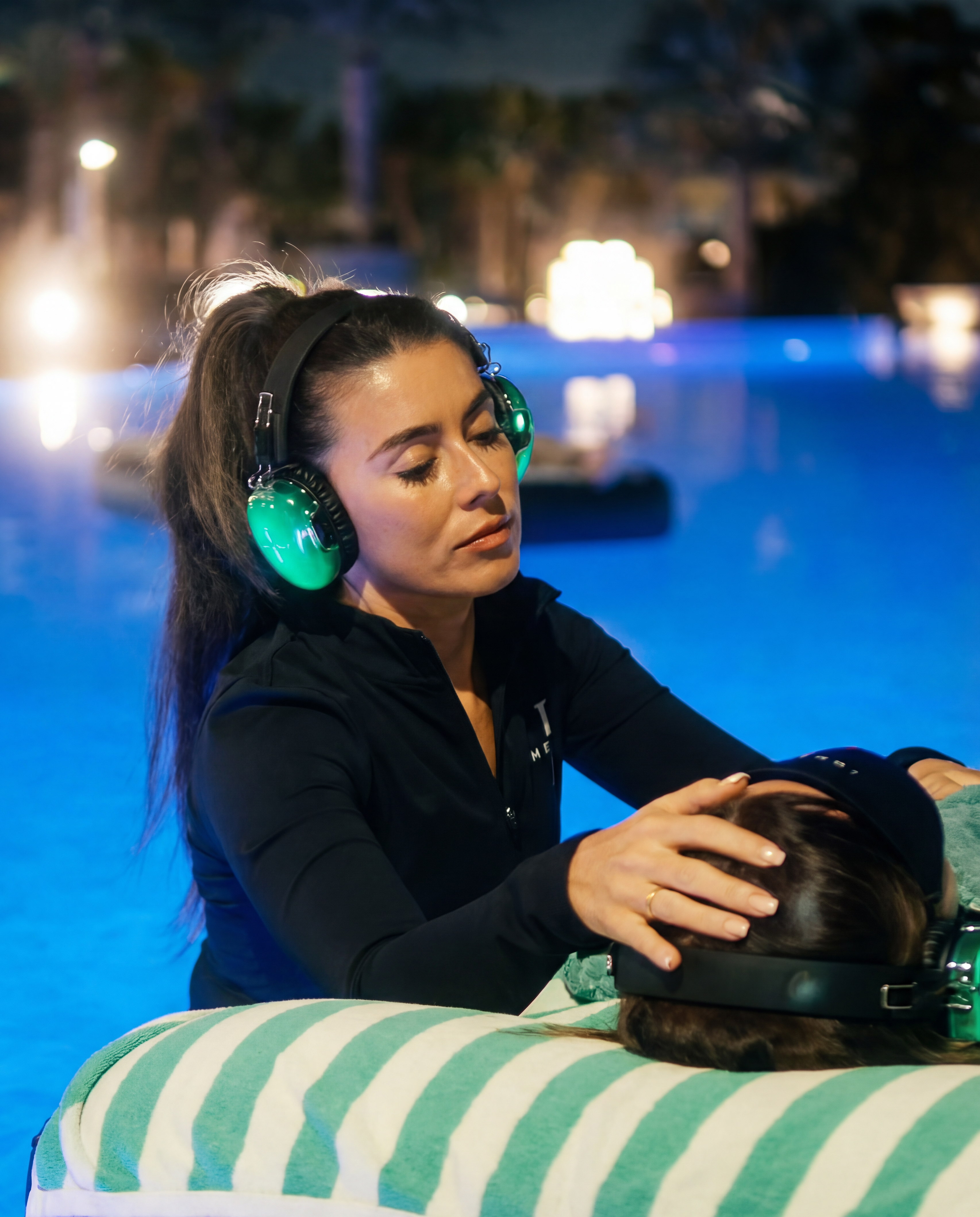 Breathwork and meditation delivered through headphones, creating a deeply personal experience within a shared space.